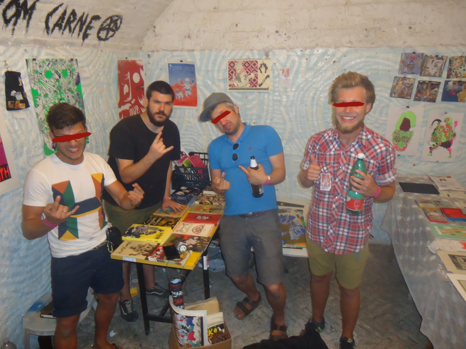 Bebemos umas, e ficámos logo amigos. Ao fim de uma hora tínhamos decidido ir morar todos juntos para uma tenda que a organização tinha arranjado para eles. Poisámos as malas e passámos o resto do dia a comer massas, pizzas, a beber vinho e Peronis e a falar de cócó, desenhos animados, vídeos do youtube e a fazer piadas gays acerca de mais logo voltar-mos para a tenda! Robert, Tron e Jackob foram uns bacanos e levaram-nos a visitar pela primeira vez as antigas celas do forte onde iriam estar as bancas… celas cheias de história e fantasmas e um silêncio atordoador, por outro lado nas paredes do exterior do forte encontrava-mos outro tipo de fantasmas que por lá também tinham passado e deixado a sua marcas, tais como: Blu ou Aleksander Zograf entre milhares de outros…o Crack é um festim para os olhos…